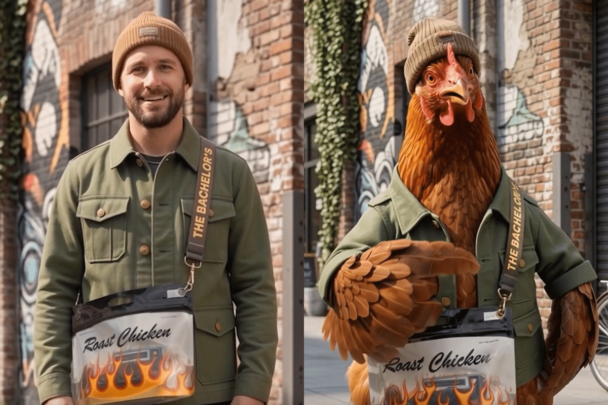 The product itself is already playful. It’s a handbag designed to look like a roast chicken bag, and part of the appeal is that it feels like a joke you’re in on. It’s slightly absurd but still wearable and importantly, still something you can imagine owning. The human ad keeps you inside that idea. It shows the product in a way that feels grounded enough to picture in real life. You can quickly imagine who might wear it, when they’d wear it, and whether that could be you. The chicken shifts your role. Instead of feeling part of the idea, you’re watching it. The focus moves from “could I wear this?” to “this is funny.” It becomes something to observe rather than something to step into.